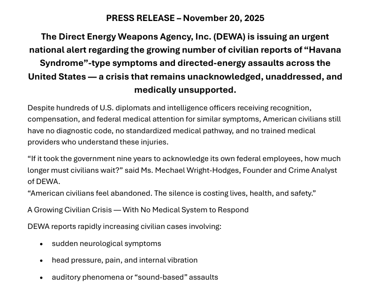 PRESS RELEASE – Number of civilian cases growing Nov 23 2025 Click here to see FULL STORY Share this: Click to share on X (Opens in new window) X Click to share on Facebook (Opens in new window) Facebook Like Loading... Related Published by Direct Energy Weapons Police - DEW POLICE View all posts by Direct Energy Weapons Police - DEW POLICE