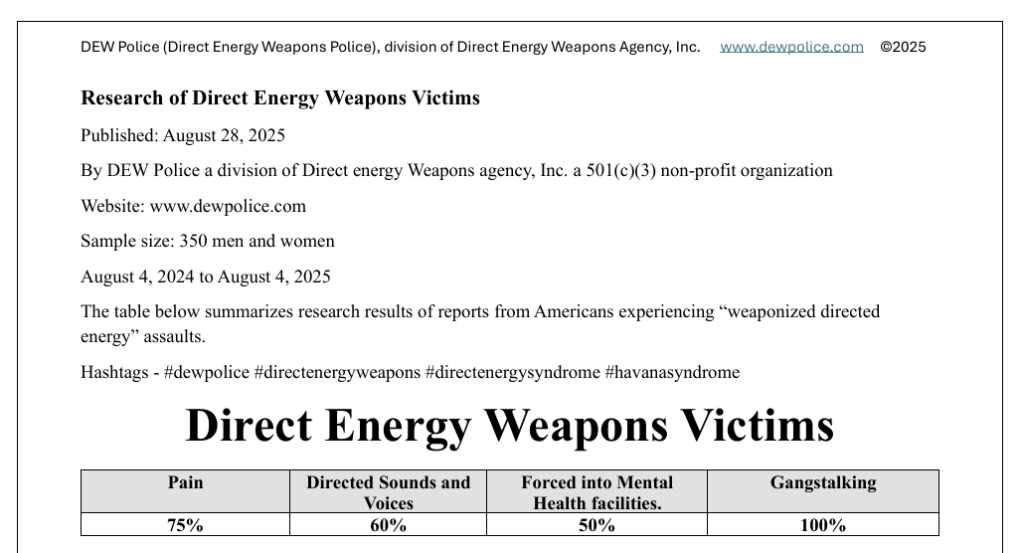 Posted on this page are results of research collected from Victims who reported experiencing directed energy harassments & assaults. Local Police collect Domestic Crime data, we collect Directed Energy Crimes data.